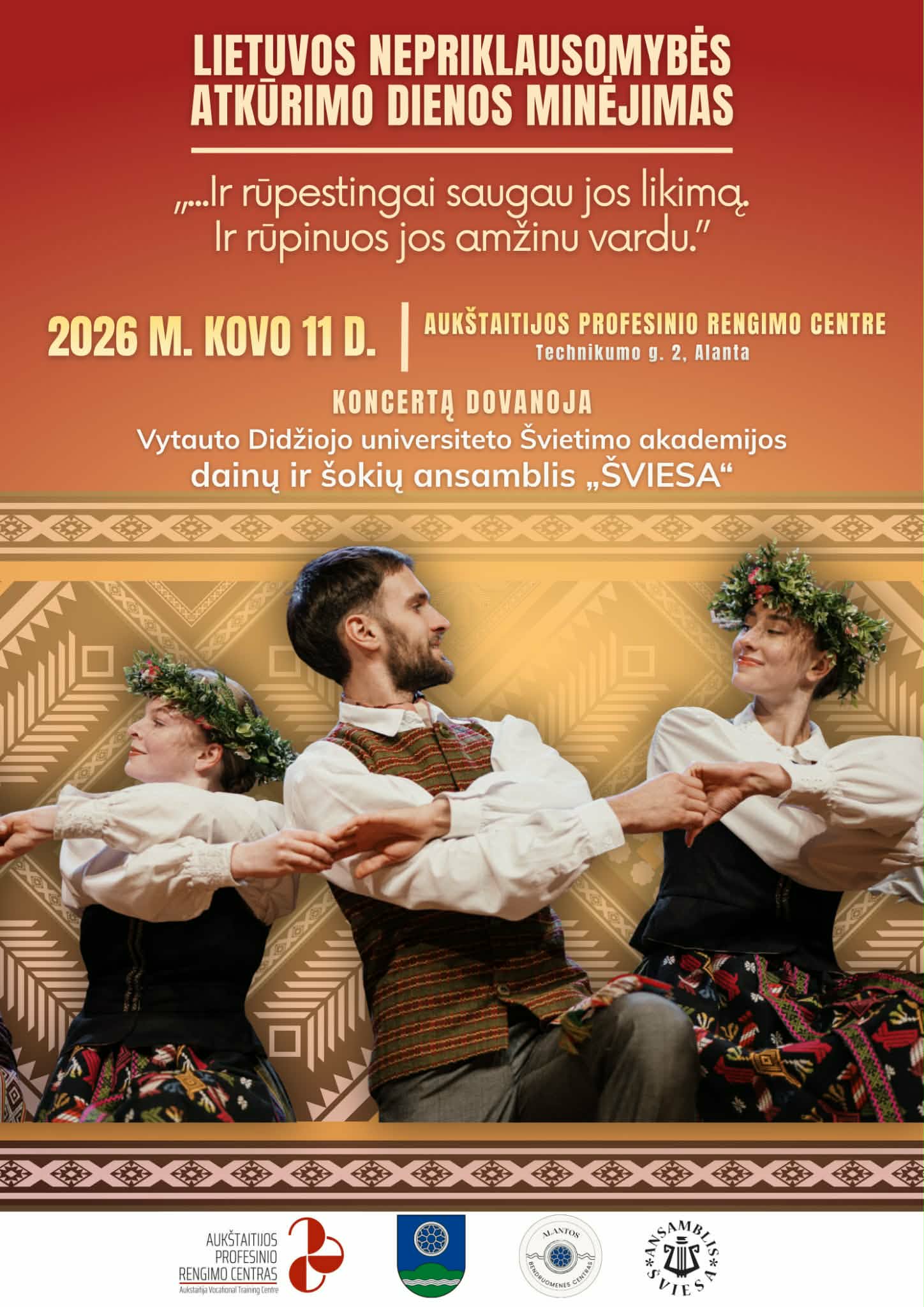 The Aukštaitija Vocational Training Centre and the Alanta Eldership invite the whole community to meaningfully commemorate the Day of the Restoration of the Independence of Lithuania—a special date that reminds us of our nation’s strength, determination, and love for our Homeland.