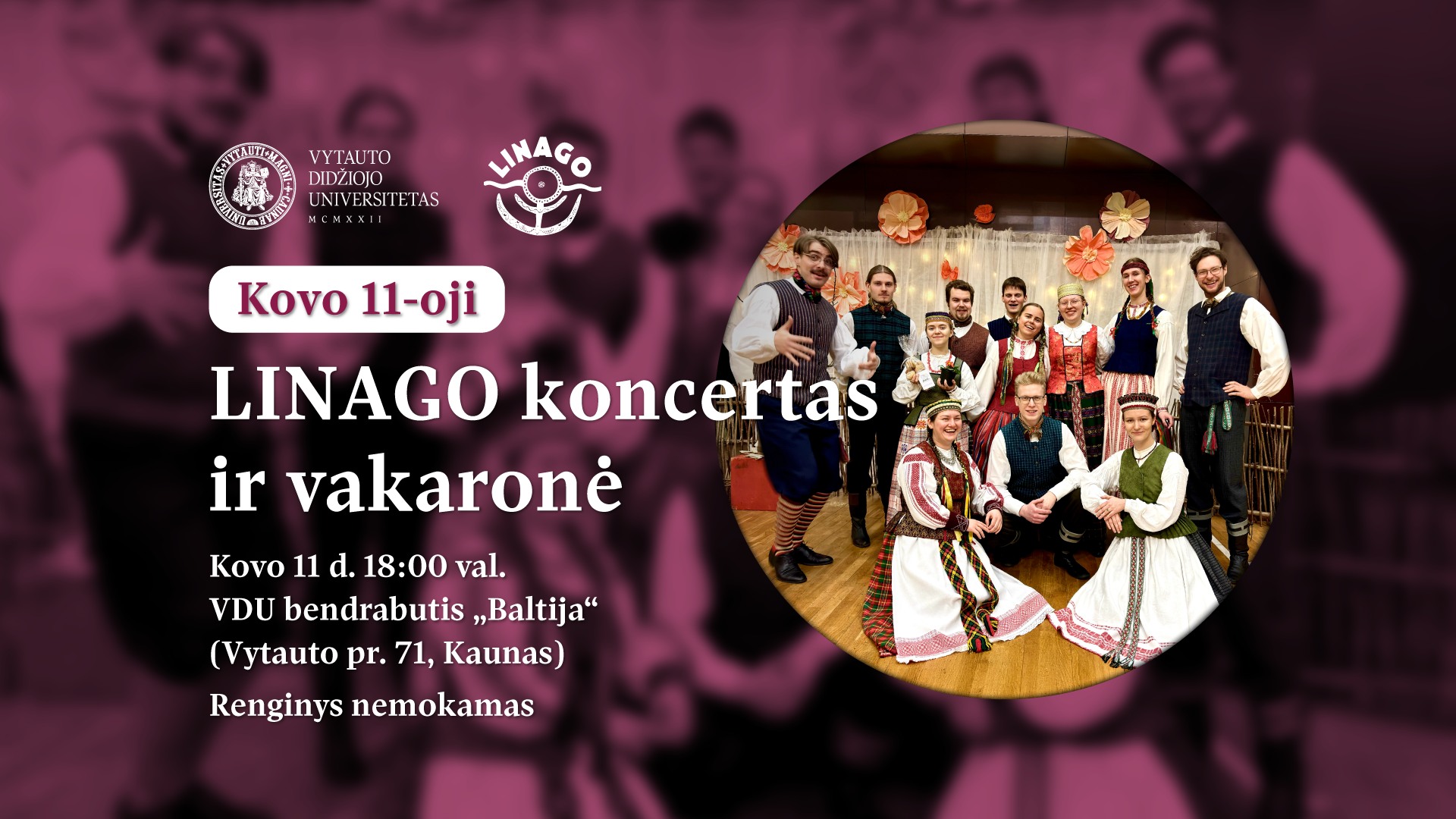 We – the VMU Folklore Ensemble “Linago” – invite you to celebrate the Day of the Restoration of Lithuania’s Independence (March 11) together. Let’s meet at 6:00 PM in the Great Hall of the VMU Baltic Dormitory (Vytauto Ave. 71, Room 101).